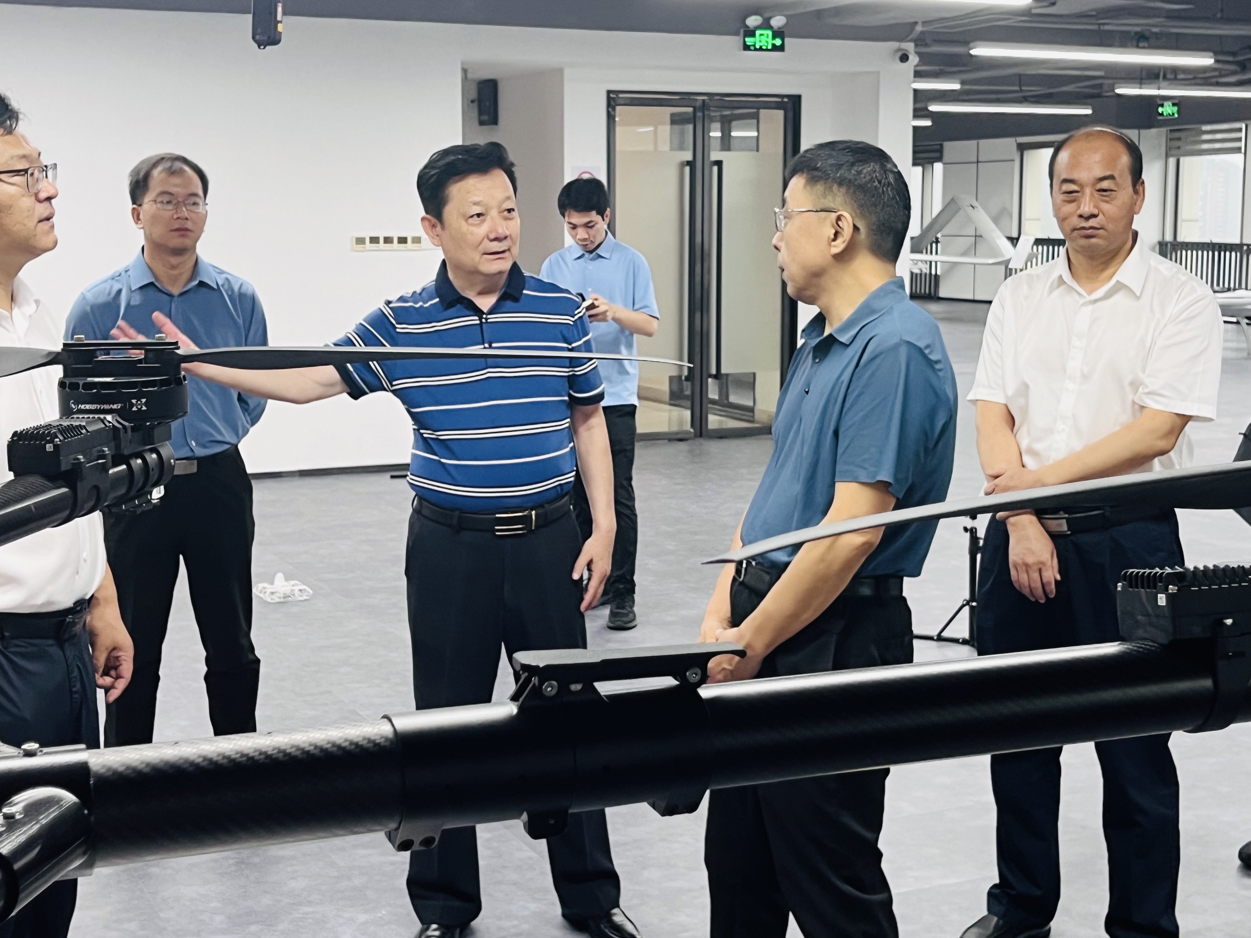 王奕文副书记认真听取汇报,不时驻足观看,对公司自主研发的中小型长航时固定翼无人机、纵列式大载重无人机表现出浓厚兴趣,并详细询问了技术参数、应用场景和市场反馈。